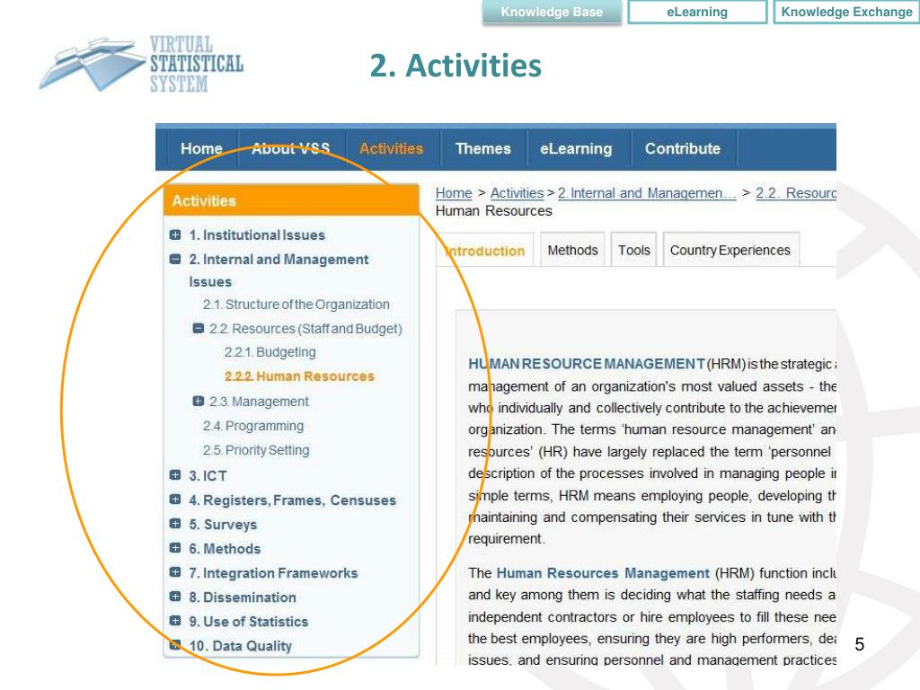 Knowledge Exchange eLearning Improved Statistical Capacity VSS Main Components Knowledge Base • Access to reference material organized by activities, themes, comments • Animated presentations • High quality power point presentations • Access to discussion groups, wiki information exchange