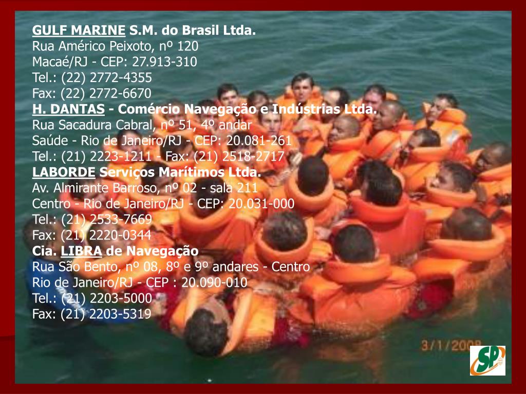 GULF MARINE S.M. do Brasil Ltda.Rua Américo Peixoto, nº 120 Macaé/RJ - CEP: 27.913-310 Tel.: (22) 2772-4355 Fax: (22) 2772-6670 H. DANTAS - Comércio Navegação e Indústrias Ltda.Rua Sacadura Cabral, nº 51, 4º andar Saúde - Rio de Janeiro/RJ - CEP: 20.081-261 Tel.: (21) 2223-1211 - Fax: (21) 2518-2717 LABORDE Serviços Marítimos Ltda.Av. Almirante Barroso, nº 02 - sala 211 Centro - Rio de Janeiro/RJ - CEP: 20.031-000 Tel.: (21) 2533-7669 Fax: (21) 2220-0344 Cia. LIBRA de NavegaçãoRua São Bento, nº 08, 8º e 9º andares - Centro Rio de Janeiro/RJ - CEP : 20.090-010 Tel.: (21) 2203-5000 Fax: (21) 2203-5319