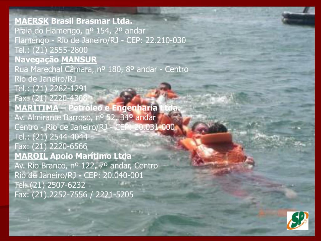 MAERSK Brasil Brasmar Ltda.Praia do Flamengo, nº 154, 2º andar Flamengo - Rio de Janeiro/RJ - CEP: 22.210-030 Tel.: (21) 2555-2800 Navegação MANSURRua Marechal Câmara, nº 180, 8º andar - Centro Rio de Janeiro/RJ Tel.: (21) 2282-1291 Fax: (21) 2220-4308 MARÍTIMA – Petróleo e Engenharia Ltda.Av. Almirante Barroso, nº 52, 34º andar Centro - Rio de Janeiro/RJ - CEP: 20.031-000 Tel.: (21) 2544-4044 Fax: (21) 2220-6566 MAROIL Apoio Marítimo LtdaAv. Rio Branco, nº 122, 7º andar, Centro Rio de Janeiro/RJ - CEP: 20.040-001 Tel: (21) 2507-6232 Fax: (21) 2252-7556 / 2221-5205
