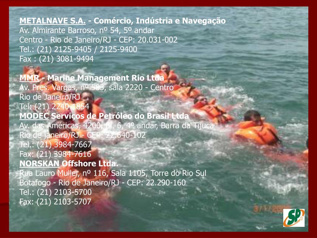 METALNAVE S.A. - Comércio, Indústria e NavegaçãoAv. Almirante Barroso, nº 54, 5º andar Centro - Rio de Janeiro/RJ - CEP: 20.031-002 Tel.: (21) 2125-9405 / 2125-9400 Fax : (21) 3081-9494 MMR - Marine Management Rio LtdaAv. Pres. Vargas, nº 583, sala 2220 - Centro Rio de Janeiro/RJ Tel: (21) 2240-1854 MODEC Serviços de Petróleo do Brasil LtdaAv. das Américas, 4200, Bl. 6, 4º andar, Barra da Tijuca Rio de janeiro/RJ - CEP: 22.640-102 Tel.: (21) 3984-7667 Fax: (21) 3984-7616 NORSKAN Offshore Ltda.Rua Lauro Muller, nº 116, Sala 1105, Torre do Rio Sul Botafogo - Rio de Janeiro/RJ - CEP: 22.290-160 Tel.: (21) 2103-5700 Fax: (21) 2103-5707