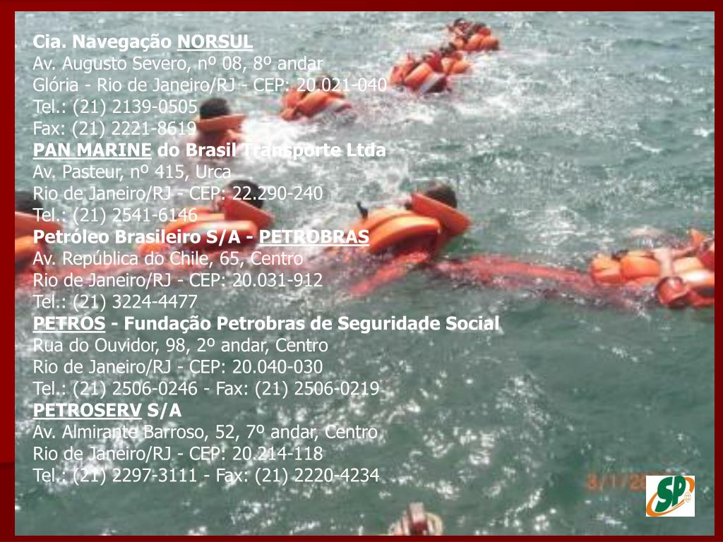Cia. Navegação NORSULAv. Augusto Severo, nº 08, 8º andar Glória - Rio de Janeiro/RJ - CEP: 20.021-040 Tel.: (21) 2139-0505 Fax: (21) 2221-8619 PAN MARINE do Brasil Transporte LtdaAv. Pasteur, nº 415, Urca Rio de Janeiro/RJ - CEP: 22.290-240 Tel.: (21) 2541-6146 Petróleo Brasileiro S/A - PETROBRASAv. República do Chile, 65, Centro Rio de Janeiro/RJ - CEP: 20.031-912 Tel.: (21) 3224-4477 PETROS - Fundação Petrobras de Seguridade SocialRua do Ouvidor, 98, 2º andar, Centro Rio de Janeiro/RJ - CEP: 20.040-030 Tel.: (21) 2506-0246 - Fax: (21) 2506-0219 PETROSERV S/AAv. Almirante Barroso, 52, 7º andar, Centro Rio de Janeiro/RJ - CEP: 20.214-118 Tel.: (21) 2297-3111 - Fax: (21) 2220-4234