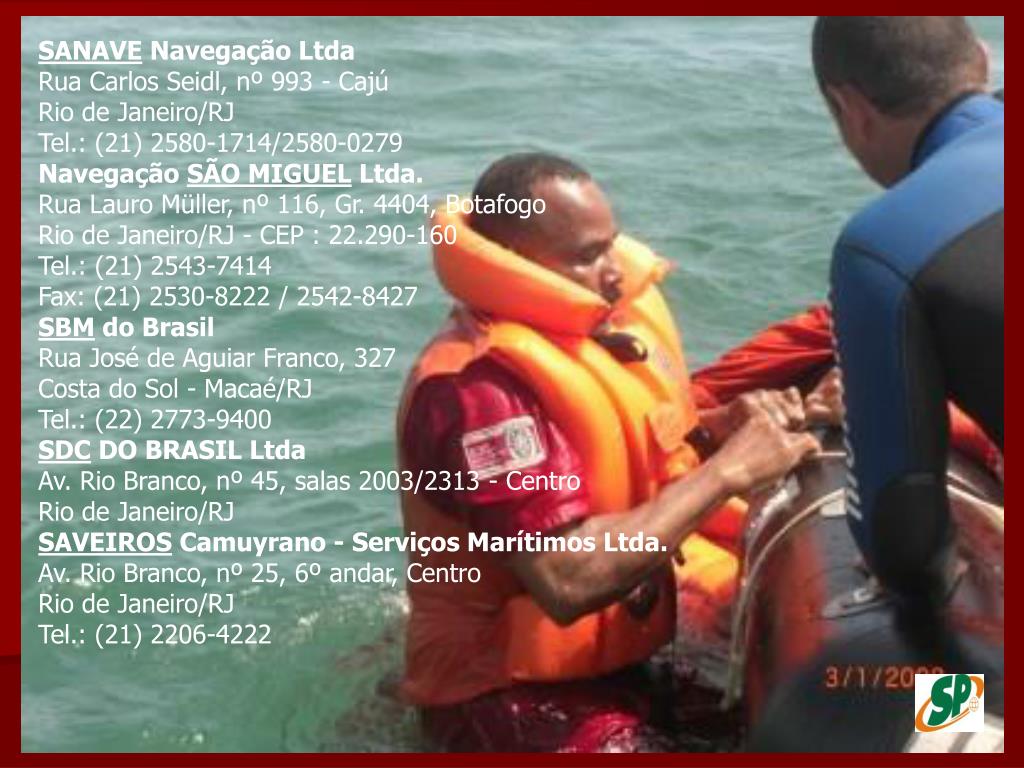 SANAVE Navegação LtdaRua Carlos Seidl, nº 993 - Cajú Rio de Janeiro/RJ Tel.: (21) 2580-1714/2580-0279 Navegação SÃO MIGUEL Ltda.Rua Lauro Müller, nº 116, Gr. 4404, Botafogo Rio de Janeiro/RJ - CEP : 22.290-160 Tel.: (21) 2543-7414 Fax: (21) 2530-8222 / 2542-8427 SBM do BrasilRua José de Aguiar Franco, 327 Costa do Sol - Macaé/RJ Tel.: (22) 2773-9400 SDC DO BRASIL LtdaAv. Rio Branco, nº 45, salas 2003/2313 - Centro Rio de Janeiro/RJ SAVEIROS Camuyrano - Serviços Marítimos Ltda.Av. Rio Branco, nº 25, 6º andar, Centro Rio de Janeiro/RJ Tel.: (21) 2206-4222