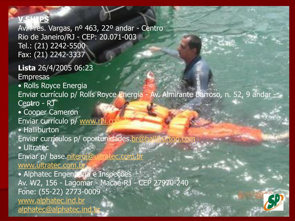 V.SHIPSAv. Pres. Vargas, nº 463, 22º andar - Centro Rio de Janeiro/RJ - CEP: 20.071-003 Tel.: (21) 2242-5500 Fax: (21) 2242-3337 Lista 26/4/2005 06:23Empresas• Rolls Royce EnergiaEnviar currículo p/ Rolls Royce Energia - Av. Almirante Barroso, n. 52, 9 andar - Centro - RJ• Cooper CameronEnviar currículo p/ www.rhi.com.br• HalliburtonEnviar currículos p/ oportunidades.br@halliburton.com• UltratecEnviar p/ base.niteroi@ultratec.com.brwww.ultratec.com.br• Alphatec Engenharia e InspeçõesAv. W2, 156 - Lagomar - Macaé-RJ - CEP 27970-240Fone: (55-22) 2773-0009www.alphatec.ind.bralphatec@alphatec.ind.br