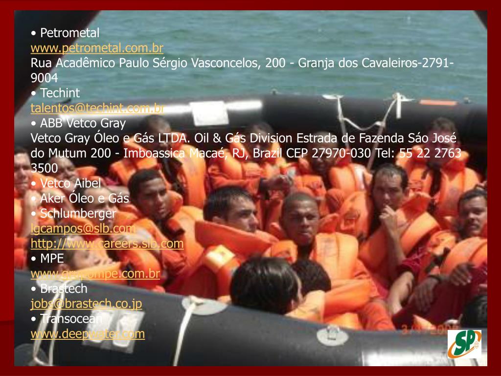 • Petrometalwww.petrometal.com.brRua Acadêmico Paulo Sérgio Vasconcelos, 200 - Granja dos Cavaleiros-2791-9004• Techinttalentos@techint.com.br• ABB Vetco GrayVetco Gray Óleo e Gás LTDA. Oil & Gás Division Estrada de Fazenda Sáo José do Mutum 200 - Imboassica Macaé, RJ, Brazil CEP 27970-030 Tel: 55 22 2763 3500 • Vetco Aibel• Aker Óleo e Gás• Schlumbergerlgcampos@slb.comhttp://www.careers.slb.com• MPEwww.grupompe.com.br• Brastechjobs@brastech.co.jp• Transoceanwww.deepwater.com