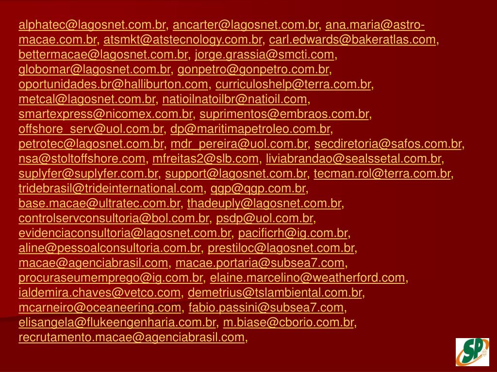 alphatec@lagosnet.com.br, ancarter@lagosnet.com.br, ana.maria@astro-macae.com.br, atsmkt@atstecnology.com.br, carl.edwards@bakeratlas.com, bettermacae@lagosnet.com.br, jorge.grassia@smcti.com, globomar@lagosnet.com.br, gonpetro@gonpetro.com.br, oportunidades.br@halliburton.com, curriculoshelp@terra.com.br, metcal@lagosnet.com.br, natioilnatoilbr@natioil.com, smartexpress@nicomex.com.br, suprimentos@embraos.com.br, offshore_serv@uol.com.br, dp@maritimapetroleo.com.br, petrotec@lagosnet.com.br, mdr_pereira@uol.com.br, secdiretoria@safos.com.br, nsa@stoltoffshore.com, mfreitas2@slb.com, liviabrandao@sealssetal.com.br, suplyfer@suplyfer.com.br, support@lagosnet.com.br, tecman.rol@terra.com.br, tridebrasil@trideinternational.com, qgp@qgp.com.br, base.macae@ultratec.com.br, thadeuply@lagosnet.com.br, controlservconsultoria@bol.com.br, psdp@uol.com.br, evidenciaconsultoria@lagosnet.com.br, pacificrh@ig.com.br, aline@pessoalconsultoria.com.br, prestiloc@lagosnet.com.br, macae@agenciabrasil.com, macae.portaria@subsea7.com, procuraseumemprego@ig.com.br, elaine.marcelino@weatherford.com, ialdemira.chaves@vetco.com, demetrius@tslambiental.com.br, mcarneiro@oceaneering.com, fabio.passini@subsea7.com, elisangela@flukeengenharia.com.br, m.biase@cborio.com.br, recrutamento.macae@agenciabrasil.com,