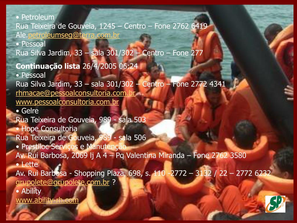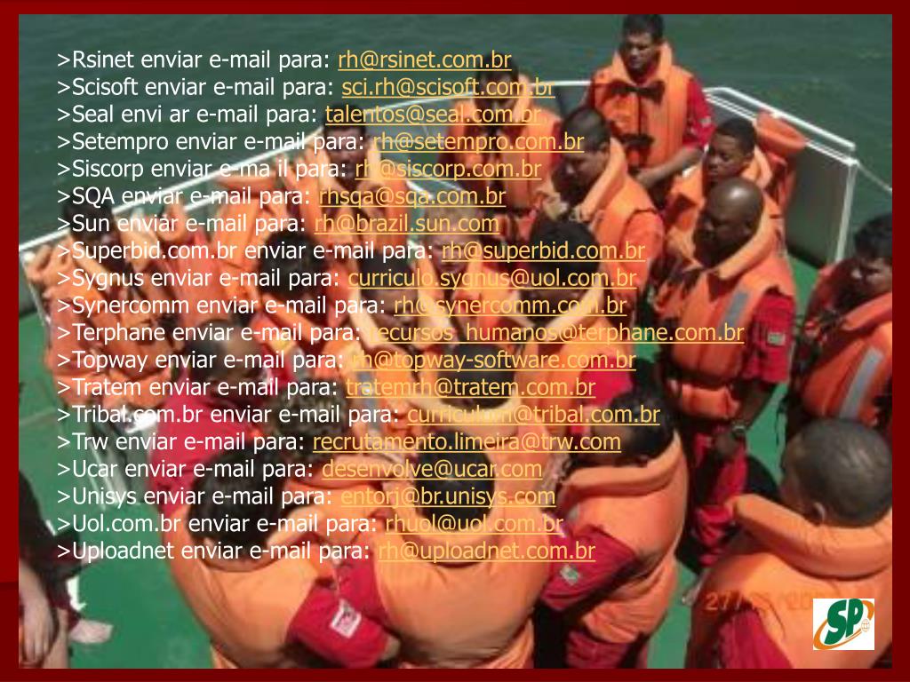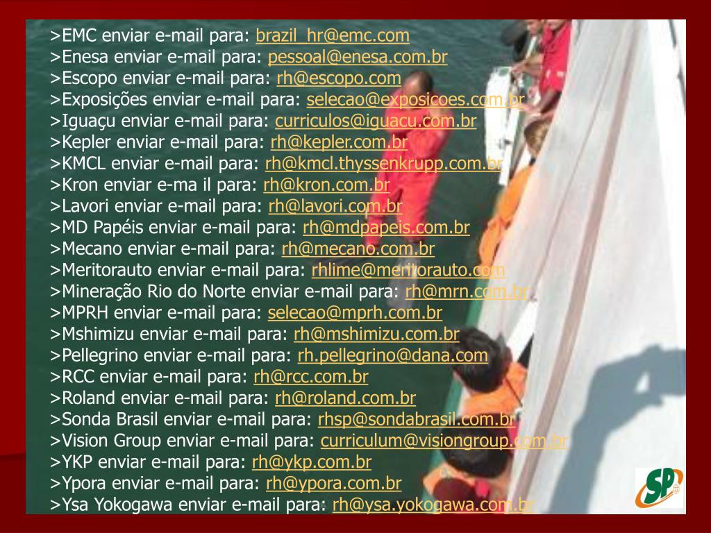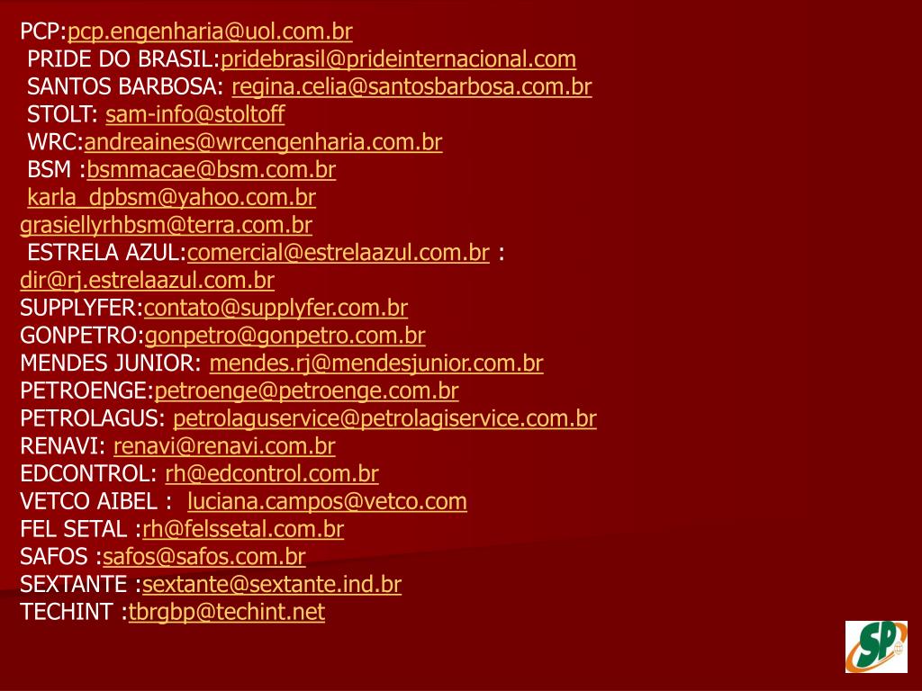 PCP:pcp.engenharia@uol.com.br PRIDE DO BRASIL:pridebrasil@prideinternacional.com SANTOS BARBOSA: regina.celia@santosbarbosa.com.br STOLT: sam-info@stoltoff WRC:andreaines@wrcengenharia.com.br BSM :bsmmacae@bsm.com.br karla_dpbsm@yahoo.com.br grasiellyrhbsm@terra.com.br ESTRELA AZUL:comercial@estrelaazul.com.br : dir@rj.estrelaazul.com.br SUPPLYFER:contato@supplyfer.com.br GONPETRO:gonpetro@gonpetro.com.br MENDES JUNIOR: mendes.rj@mendesjunior.com.br PETROENGE:petroenge@petroenge.com.br PETROLAGUS: petrolaguservice@petrolagiservice.com.br RENAVI: renavi@renavi.com.br EDCONTROL: rh@edcontrol.com.br VETCO AIBEL : luciana.campos@vetco.com FEL SETAL :rh@felssetal.com.br SAFOS :safos@safos.com.br SEXTANTE :sextante@sextante.ind.br TECHINT :tbrgbp@techint.net