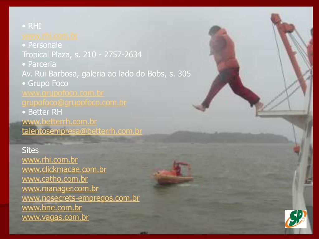 • RHIwww.rhi.com.br• PersonaleTropical Plaza, s. 210 - 2757-2634• ParceriaAv. Rui Barbosa, galeria ao lado do Bobs, s. 305• Grupo Focowww.grupofoco.com.brgrupofoco@grupofoco.com.br• Better RHwww.betterrh.com.brtalentosempresa@betterrh.com.brSiteswww.rhi.com.brwww.clickmacae.com.brwww.catho.com.brwww.manager.com.brwww.nosecrets-empregos.com.brwww.bne.com.brwww.vagas.com.br