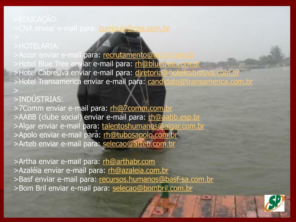 >EDUCAÇÃO: >CNA enviar e-mail para: curriculo@cna.com.br> >HOTELARIA: >Accor enviar e-mail para: recrutamento@accor.com.br>Hotel Blue Tree enviar e-mail para: rh@bluetree.com.br>Hotel Cabreuva enviar e-mail para: diretoria@hotelcabreuva.com.br>Hotel Transamerica enviar e-mail para: candidato@transamerica.com.br> >INDÚSTRIAS: >7Comm enviar e-mail para: rh@7comm.com.br>AABB (clube social) enviar e-mail para: rh@aabb.esp.br>Algar enviar e-mail para: talentoshumanos@algar.com.br>Apolo enviar e-mail para: rh@tubosapolo.com.br>Arteb enviar e-mail para: selecao@arteb.com.br>Artha enviar e-mail para: rh@arthabr.com>Azaléia enviar e-mail para: rh@azaleia.com.br>Basf enviar e-mail para: recursos.humanos@basf-sa.com.br>Bom Bril enviar e-mail para: selecao@bombril.com.br