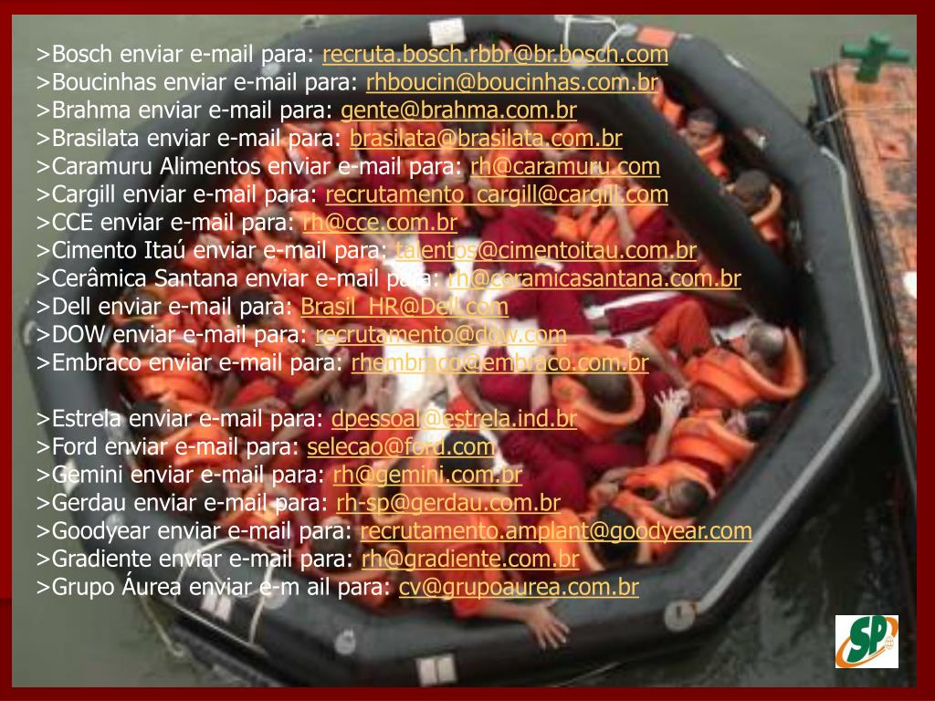 >Bosch enviar e-mail para: recruta.bosch.rbbr@br.bosch.com>Boucinhas enviar e-mail para: rhboucin@boucinhas.com.br>Brahma enviar e-mail para: gente@brahma.com.br>Brasilata enviar e-mail para: brasilata@brasilata.com.br>Caramuru Alimentos enviar e-mail para: rh@caramuru.com>Cargill enviar e-mail para: recrutamento_cargill@cargill.com>CCE enviar e-mail para: rh@cce.com.br>Cimento Itaú enviar e-mail para: talentos@cimentoitau.com.br>Cerâmica Santana enviar e-mail para: rh@ceramicasantana.com.br>Dell enviar e-mail para: Brasil_HR@Dell.com>DOW enviar e-mail para: recrutamento@dow.com>Embraco enviar e-mail para: rhembraco@embraco.com.br>Estrela enviar e-mail para: dpessoal@estrela.ind.br>Ford enviar e-mail para: selecao@ford.com>Gemini enviar e-mail para: rh@gemini.com.br>Gerdau enviar e-mail para: rh-sp@gerdau.com.br>Goodyear enviar e-mail para: recrutamento.amplant@goodyear.com>Gradiente enviar e-mail para: rh@gradiente.com.br>Grupo Áurea enviar e-m ail para: cv@grupoaurea.com.br