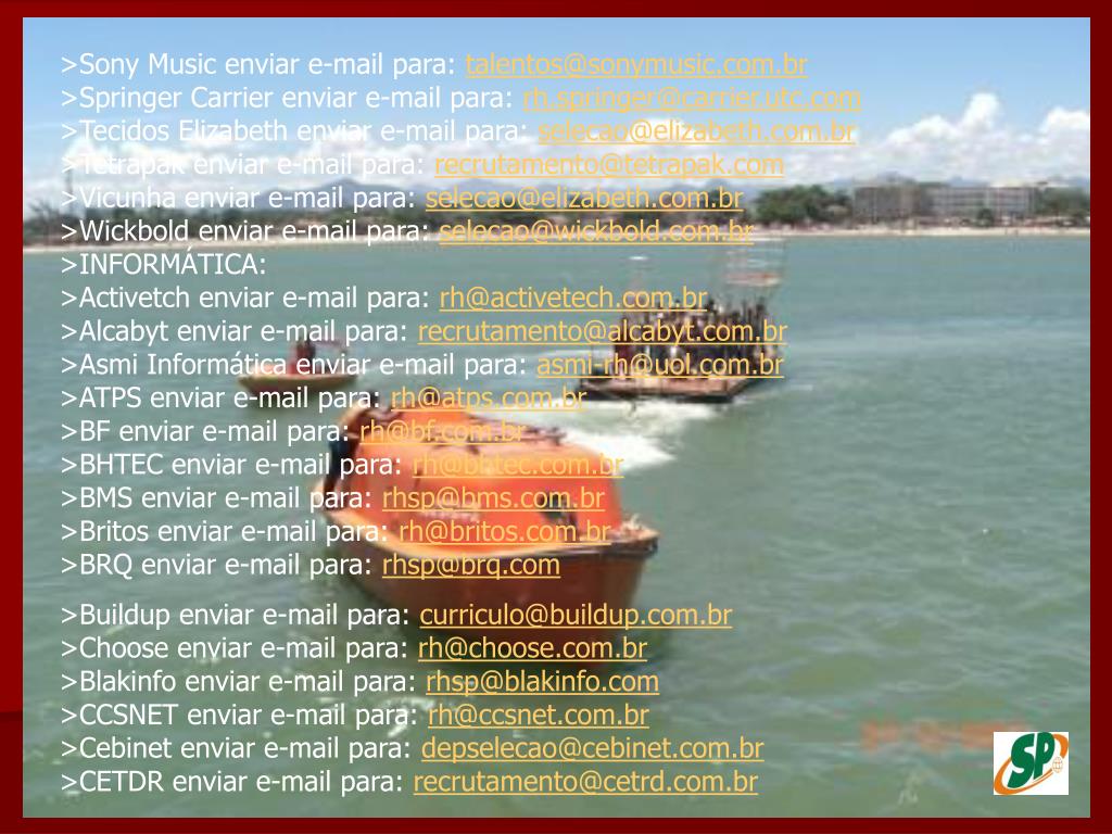 >Sony Music enviar e-mail para: talentos@sonymusic.com.br>Springer Carrier enviar e-mail para: rh.springer@carrier.utc.com>Tecidos Elizabeth enviar e-mail para: selecao@elizabeth.com.br>Tetrapak enviar e-mail para: recrutamento@tetrapak.com>Vicunha enviar e-mail para: selecao@elizabeth.com.br>Wickbold enviar e-mail para: selecao@wickbold.com.br>INFORMÁTICA: >Activetch enviar e-mail para: rh@activetech.com.br>Alcabyt enviar e-mail para: recrutamento@alcabyt.com.br>Asmi Informática enviar e-mail para: asmi-rh@uol.com.br>ATPS enviar e-mail para: rh@atps.com.br>BF enviar e-mail para: rh@bf.com.br>BHTEC enviar e-mail para: rh@bhtec.com.br>BMS enviar e-mail para: rhsp@bms.com.br>Britos enviar e-mail para: rh@britos.com.br>BRQ enviar e-mail para: rhsp@brq.com >Buildup enviar e-mail para: curriculo@buildup.com.br>Choose enviar e-mail para: rh@choose.com.br>Blakinfo enviar e-mail para: rhsp@blakinfo.com>CCSNET enviar e-mail para: rh@ccsnet.com.br>Cebinet enviar e-mail para: depselecao@cebinet.com.br>CETDR enviar e-mail para: recrutamento@cetrd.com.br