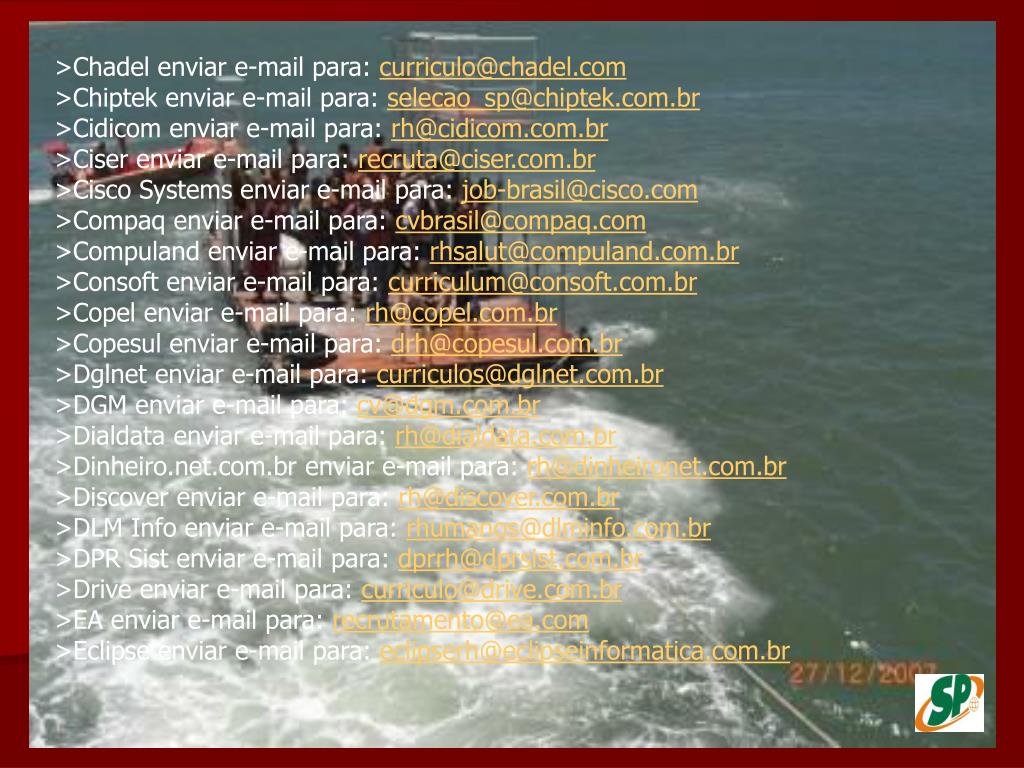 >Chadel enviar e-mail para: curriculo@chadel.com>Chiptek enviar e-mail para: selecao_sp@chiptek.com.br>Cidicom enviar e-mail para: rh@cidicom.com.br>Ciser enviar e-mail para: recruta@ciser.com.br>Cisco Systems enviar e-mail para: job-brasil@cisco.com>Compaq enviar e-mail para: cvbrasil@compaq.com>Compuland enviar e-mail para: rhsalut@compuland.com.br>Consoft enviar e-mail para: curriculum@consoft.com.br>Copel enviar e-mail para: rh@copel.com.br>Copesul enviar e-mail para: drh@copesul.com.br>Dglnet enviar e-mail para: curriculos@dglnet.com.br>DGM enviar e-mail para: cv@dgm.com.br>Dialdata enviar e-mail para: rh@dialdata.com.br>Dinheiro.net.com.br enviar e-mail para: rh@dinheironet.com.br>Discover enviar e-mail para: rh@discover.com.br>DLM Info enviar e-mail para: rhumanos@dlminfo.com.br>DPR Sist enviar e-mail para: dprrh@dprsist.com.br>Drive enviar e-mail para: curriculo@drive.com.br>EA enviar e-mail para: recrutamento@ea.com>Eclipse enviar e-mail para: eclipserh@eclipseinformatica.com.br