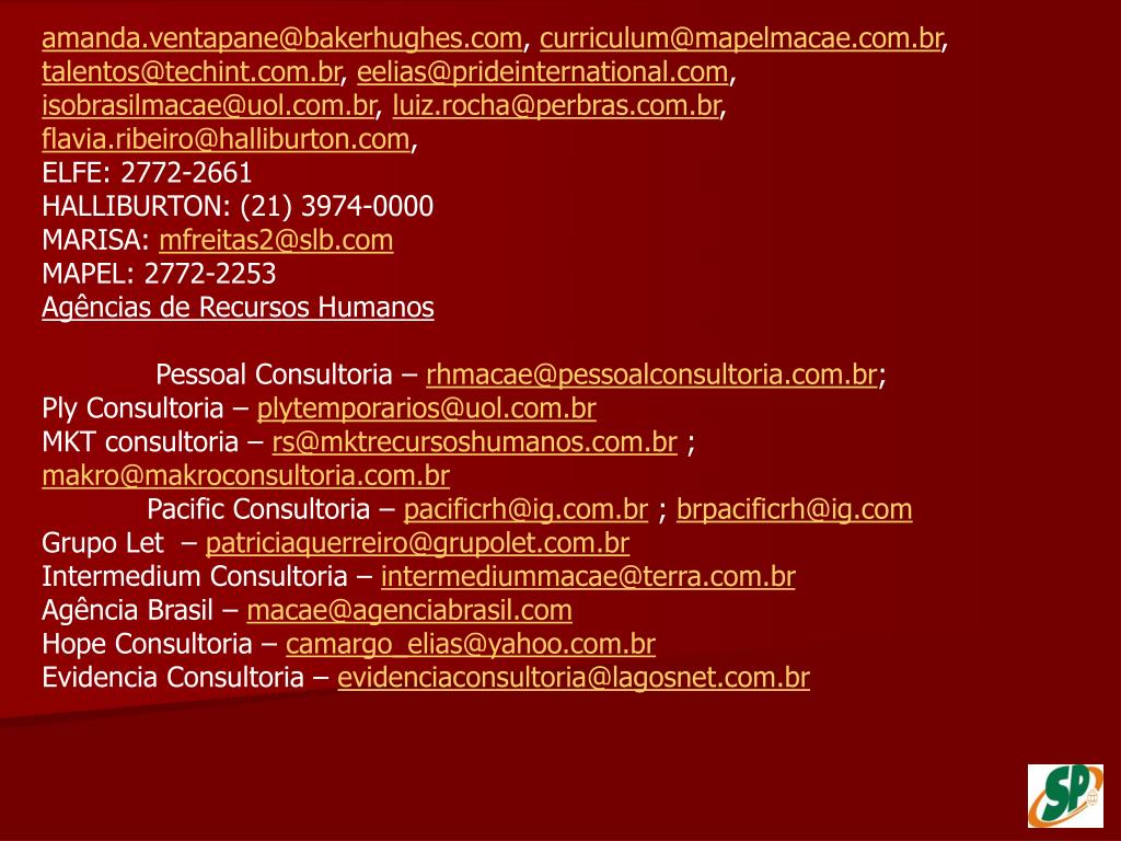 amanda.ventapane@bakerhughes.com, curriculum@mapelmacae.com.br, talentos@techint.com.br, eelias@prideinternational.com, isobrasilmacae@uol.com.br, luiz.rocha@perbras.com.br, flavia.ribeiro@halliburton.com, ELFE: 2772-2661 HALLIBURTON: (21) 3974-0000 MARISA: mfreitas2@slb.com MAPEL: 2772-2253 Agências de Recursos Humanos Pessoal Consultoria – rhmacae@pessoalconsultoria.com.br; Ply Consultoria – plytemporarios@uol.com.br MKT consultoria – rs@mktrecursoshumanos.com.br ; makro@makroconsultoria.com.br Pacific Consultoria – pacificrh@ig.com.br ; brpacificrh@ig.com Grupo Let – patriciaquerreiro@grupolet.com.br Intermedium Consultoria – intermediummacae@terra.com.br Agência Brasil – macae@agenciabrasil.com Hope Consultoria – camargo_elias@yahoo.com.br Evidencia Consultoria – evidenciaconsultoria@lagosnet.com.br