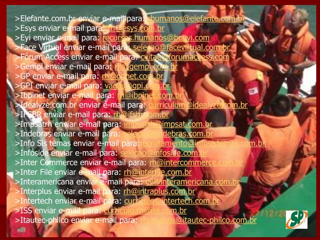 >Elefante.com.br enviar e-mail para: rhumanos@elefante.com.br>Esys enviar e-mail para: rh@esys.com.br>Eyi enviar e-mail para: recursos.humanos@br.eyi.com>Face Virtual enviar e-mail para: selecao@facevirtual.com.br>Fórum Access enviar e-mail para: cvitae@forumaccess.com>Gempi enviar e-mail para: rh@gempi.com.br>GP enviar e-mail para: rh@gpnet.com.br>GPI enviar e-mail para: vagas@gpi.com.br>Ibpinet enviar e-mail para: rh@ibpinet.com.br>Idealyze.com.br enviar e-mail para: curriculum@idealyze.com.br>IFSBR enviar e-mail para: rh@ifsbr.com.br>Impsatrh enviar e-mail para: impsatrh@impsat.com.br>Indebras enviar e-mail para: selecao@indebras.com.br>Info Sis temas enviar e-mail para:recrutamento@infosistemas.com.br>Infoside enviar e-mail para: selecao@infoside.com.br>Inter Commerce enviar e-mail para: rh@intercommerce.com.br>Inter File enviar e-mail para: rh@interfile.com.br>Interamericana enviar e-mail para: cv@interamericana.com.br>Interplus enviar e-mail para: rh@intraplus.com.br>Intertech enviar e-mail para: curriculo@intertech.com.br>ISS enviar e-mail para: curriculo.rh@iss.com.br>Itautec-philco enviar e-mail para: rhumanos@itautec-philco.com.br