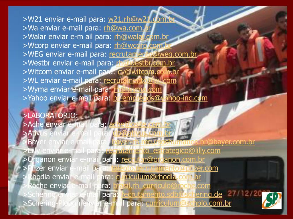 >W21 enviar e-mail para: w21.rh@w21.com.br>Wa enviar e-mail para: rh@wa.com.br>Walar enviar e-m ail para: rh@walar.com.br>Wcorp enviar e-mail para: rh@wcorp.com.br>WEG enviar e-mail para: recrutamento@weg.com.br>Westbr enviar e-mail para: rh@westbr.com.br>Witcom enviar e-mail para: cv@witcom.com.br>WL enviar e-mail para: recrutamento@wl.com>Wyma enviar e-mail para: rh@wyma.com>Yahoo enviar e-mail para: br-empregos@yahoo-inc.com>LABORATORIO: >Ache enviar e-mail para: ache@osite.com.br>Ativus enviar e-mail para: dp@ativus.com.br>Bayer enviar e-mail para: bayer-rh.recursoshumanos.br@bayer.com.br>Lilly enviar e-mail para: recrutamento_estrategico@lilly.com>Organon enviar e-mail para: recrutar@organon.com.br>Pfizer enviar e-mail para: talento.recrutamento@pfizer.com>Rhodia enviar e-mail para: curriculum@rhodia.com.br>Roche enviar e-mail para: brasil.rh_curriculo@roche.com>Schering enviar e-mail para: recrutamento.sdb@schering.de>Schering-Plough enviar e-mail para: curriculum@schplo.com.br
