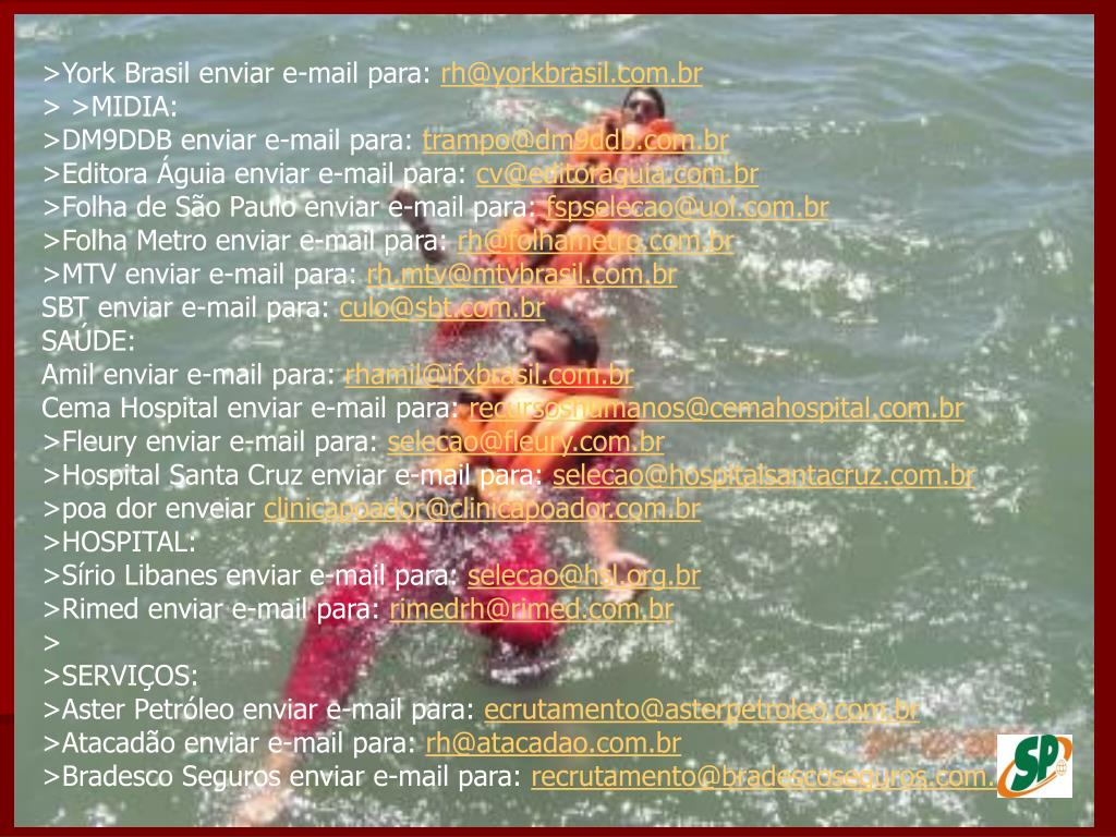>York Brasil enviar e-mail para: rh@yorkbrasil.com.br> >MIDIA: >DM9DDB enviar e-mail para: trampo@dm9ddb.com.br>Editora Águia enviar e-mail para: cv@editoraguia.com.br>Folha de São Paulo enviar e-mail para: fspselecao@uol.com.br>Folha Metro enviar e-mail para: rh@folhametro.com.br>MTV enviar e-mail para: rh.mtv@mtvbrasil.com.brSBT enviar e-mail para: culo@sbt.com.brSAÚDE: Amil enviar e-mail para: rhamil@ifxbrasil.com.brCema Hospital enviar e-mail para: recursoshumanos@cemahospital.com.br>Fleury enviar e-mail para: selecao@fleury.com.br>Hospital Santa Cruz enviar e-mail para: selecao@hospitalsantacruz.com.br>poa dor enveiar clinicapoador@clinicapoador.com.br>HOSPITAL: >Sírio Libanes enviar e-mail para: selecao@hsl.org.br>Rimed enviar e-mail para: rimedrh@rimed.com.br> >SERVIÇOS: >Aster Petróleo enviar e-mail para: ecrutamento@asterpetroleo.com.br>Atacadão enviar e-mail para: rh@atacadao.com.br>Bradesco Seguros enviar e-mail para: recrutamento@bradescoseguros.com.br