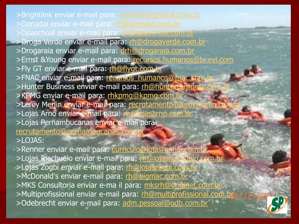 >Brightlink enviar e-mail para: cvlink@brightlink.com.br>Denadai enviar e-mail para: rh@denadai.com.br>Dpaschoal enviar e-mail para: rh@dpaschoal.com.br>Droga Verde enviar e-mail para: rh@drogaverde.com.br>Drogaraia enviar e-mail para: drh@drogaraia.com.br>Ernst &Young enviar e-mail para: recursos.humanos@br.eyi.com>Fly GT enviar e-mail para: rh@flygt.com.br>FNAC enviar e-mail para: recursos_humanos@fnac.com.br>Hunter Business enviar e-mail para: rh@hunterbusiness.com.br>KPMG enviar e-mail para: rhkpmg@kpmg.com.br>Leroy Merlin enviar e-mail para: recrutamento@leroymerlin.com.br>Lojas Arno enviar e-mail para: rh@lojasarno.com.br>Lojas Pernambucanas enviar e-mail para: recrutamento@pernambucanas.com.br>LOJAS: >Renner enviar e-mail para: curriculo@lojasrenner.com.br>Lojas Riachuelo enviar e-mail para: rh@lojasriachuelo.com.br>Lojas Zogbi enviar e-mail para: rh@lojaszogbi.com.br>McDonald's enviar e-mail para: rh@bigmac.com.br>MKS Consultoria enviar e-ma il para: mksrh@originet.com.br>Multiprofissional enviar e-mail para: rh@multiprofissional.com.br>Odebrecht enviar e-mail para: adm.pessoal@odb.com.br