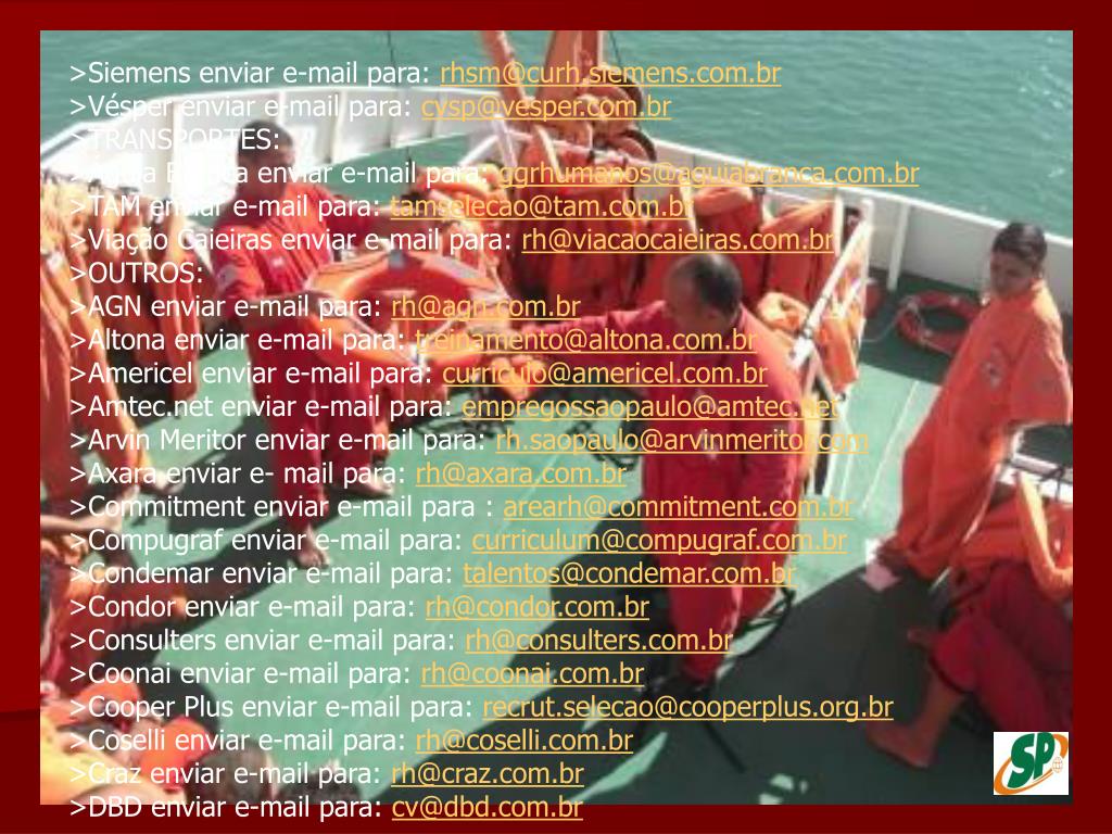 >Siemens enviar e-mail para: rhsm@curh.siemens.com.br>Vésper enviar e-mail para: cvsp@vesper.com.br>TRANSPORTES: >Águia Branca enviar e-mail para: ggrhumanos@aguiabranca.com.br>TAM enviar e-mail para: tamselecao@tam.com.br>Viação Caieiras enviar e-mail para: rh@viacaocaieiras.com.br>OUTROS: >AGN enviar e-mail para: rh@agn.com.br>Altona enviar e-mail para: treinamento@altona.com.br>Americel enviar e-mail para: curriculo@americel.com.br>Amtec.net enviar e-mail para: empregossaopaulo@amtec.net>Arvin Meritor enviar e-mail para: rh.saopaulo@arvinmeritor.com>Axara enviar e- mail para: rh@axara.com.br>Commitment enviar e-mail para : arearh@commitment.com.br>Compugraf enviar e-mail para: curriculum@compugraf.com.br>Condemar enviar e-mail para: talentos@condemar.com.br>Condor enviar e-mail para: rh@condor.com.br>Consulters enviar e-mail para: rh@consulters.com.br>Coonai enviar e-mail para: rh@coonai.com.br>Cooper Plus enviar e-mail para: recrut.selecao@cooperplus.org.br>Coselli enviar e-mail para: rh@coselli.com.br>Craz enviar e-mail para: rh@craz.com.br>DBD enviar e-mail para: cv@dbd.com.br
