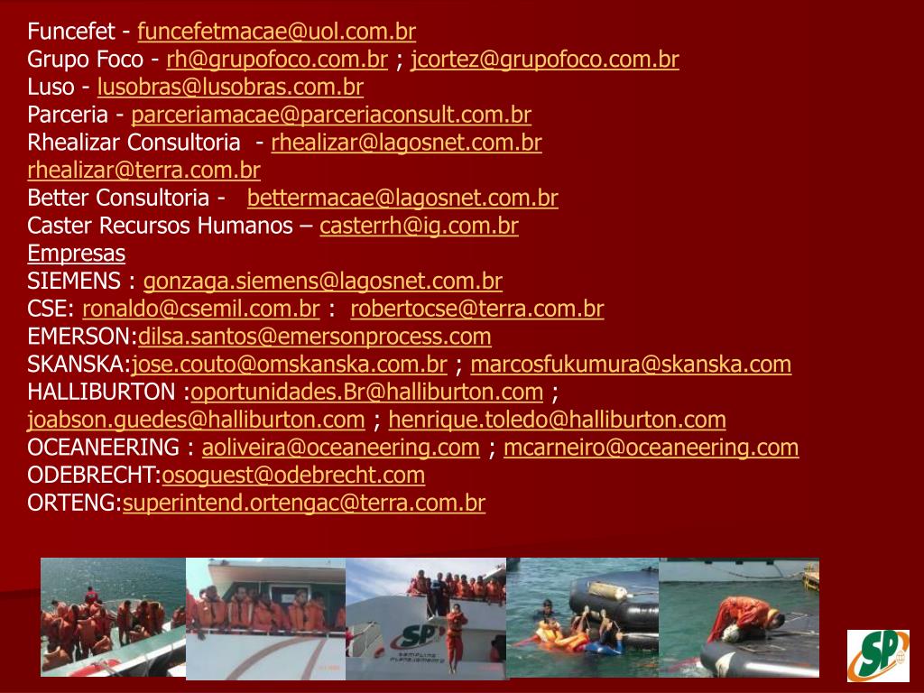 Funcefet - funcefetmacae@uol.com.br Grupo Foco - rh@grupofoco.com.br ; jcortez@grupofoco.com.br Luso - lusobras@lusobras.com.br Parceria - parceriamacae@parceriaconsult.com.br Rhealizar Consultoria - rhealizar@lagosnet.com.br rhealizar@terra.com.br Better Consultoria - bettermacae@lagosnet.com.br Caster Recursos Humanos – casterrh@ig.com.br Empresas SIEMENS : gonzaga.siemens@lagosnet.com.br CSE: ronaldo@csemil.com.br : robertocse@terra.com.br EMERSON:dilsa.santos@emersonprocess.com SKANSKA:jose.couto@omskanska.com.br ; marcosfukumura@skanska.com HALLIBURTON :oportunidades.Br@halliburton.com ; joabson.guedes@halliburton.com ; henrique.toledo@halliburton.com OCEANEERING : aoliveira@oceaneering.com ; mcarneiro@oceaneering.com ODEBRECHT:osoguest@odebrecht.com ORTENG:superintend.ortengac@terra.com.br