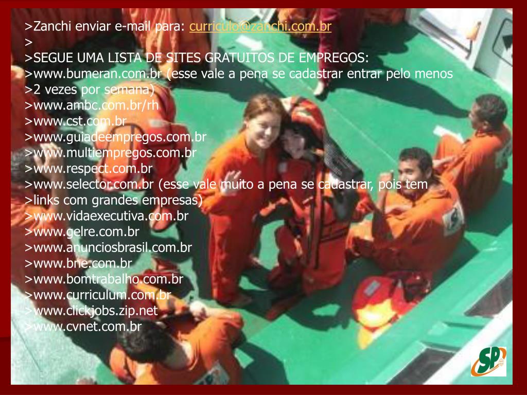 >Zanchi enviar e-mail para: curriculo@zanchi.com.br> >SEGUE UMA LISTA DE SITES GRATUITOS DE EMPREGOS: >www.bumeran.com.br (esse vale a pena se cadastrar entrar pelo menos >2 vezes por semana) >www.ambc.com.br/rh >www.cst.com.br >www.guiadeempregos.com.br >www.multiempregos.com.br >www.respect.com.br >www.selector.com.br (esse vale muito a pena se cadastrar, pois tem >links com grandes empresas) >www.vidaexecutiva.com.br >www.gelre.com.br >www.anunciosbrasil.com.br >www.bne.com.br >www.bomtrabalho.com.br >www.curriculum.com.br >www.clickjobs.zip.net >www.cvnet.com.br