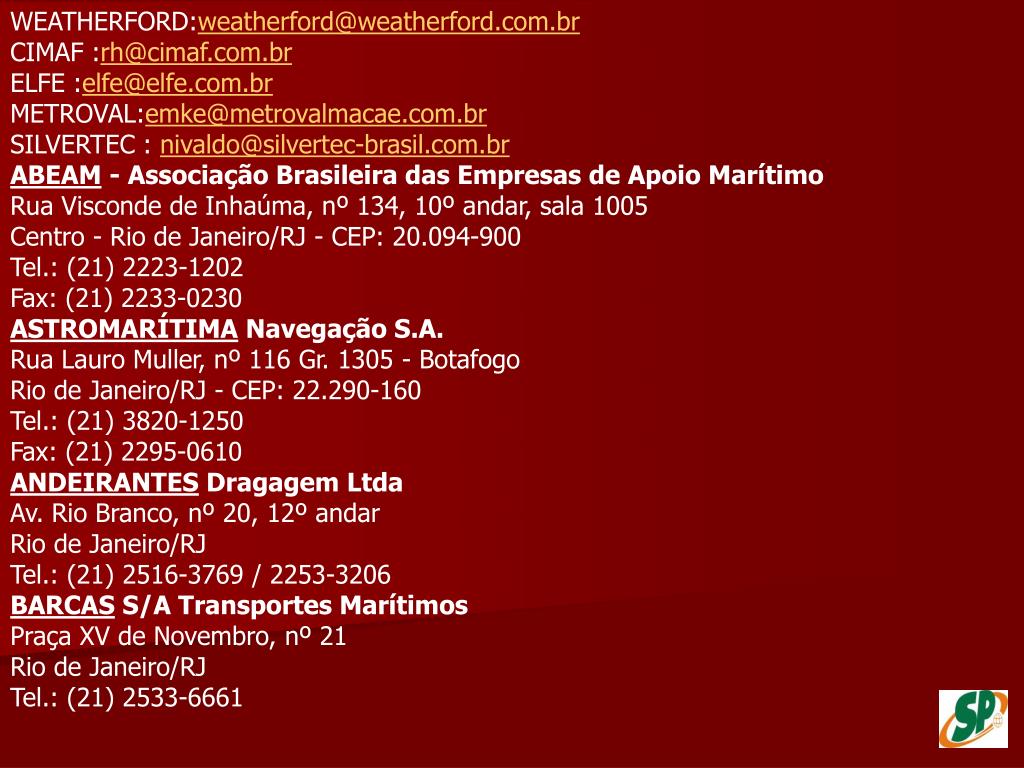 WEATHERFORD:weatherford@weatherford.com.br CIMAF :rh@cimaf.com.br ELFE :elfe@elfe.com.br METROVAL:emke@metrovalmacae.com.br SILVERTEC : nivaldo@silvertec-brasil.com.br ABEAM - Associação Brasileira das Empresas de Apoio MarítimoRua Visconde de Inhaúma, nº 134, 10º andar, sala 1005 Centro - Rio de Janeiro/RJ - CEP: 20.094-900 Tel.: (21) 2223-1202 Fax: (21) 2233-0230 ASTROMARÍTIMA Navegação S.A.Rua Lauro Muller, nº 116 Gr. 1305 - Botafogo Rio de Janeiro/RJ - CEP: 22.290-160 Tel.: (21) 3820-1250 Fax: (21) 2295-0610 ANDEIRANTES Dragagem LtdaAv. Rio Branco, nº 20, 12º andar Rio de Janeiro/RJ Tel.: (21) 2516-3769 / 2253-3206 BARCAS S/A Transportes MarítimosPraça XV de Novembro, nº 21 Rio de Janeiro/RJ Tel.: (21) 2533-6661
