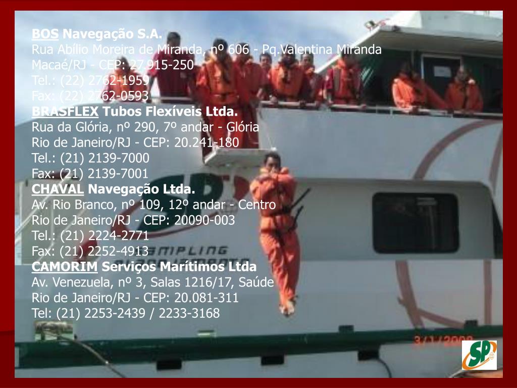 BOS Navegação S.A.Rua Abílio Moreira de Miranda, nº 606 - Pq.Valentina Miranda Macaé/RJ - CEP: 27.915-250 Tel.: (22) 2762-1959 Fax: (22) 2762-0593 BRASFLEX Tubos Flexíveis Ltda.Rua da Glória, nº 290, 7º andar - Glória Rio de Janeiro/RJ - CEP: 20.241-180 Tel.: (21) 2139-7000 Fax: (21) 2139-7001 CHAVAL Navegação Ltda.Av. Rio Branco, nº 109, 12º andar - Centro Rio de Janeiro/RJ - CEP: 20090-003 Tel.: (21) 2224-2771 Fax: (21) 2252-4913 CAMORIM Serviços Marítimos LtdaAv. Venezuela, nº 3, Salas 1216/17, Saúde Rio de Janeiro/RJ - CEP: 20.081-311 Tel: (21) 2253-2439 / 2233-3168