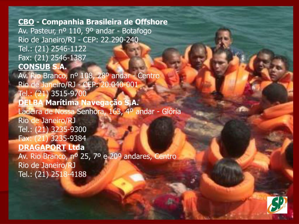 TRANSHIP Transportes Marítimos Ltda.Av. Venezuela, nº 03, salas 1208 a 1213 - Saúde Rio de Janeiro/RJ - CEP: 20.081-311 Tel.: (21) 2263-4645 Petrobrás Transp. S/A TRANSPETROAv. Presidente Vargas, 328, Centro Rio de Janeiro/RJ Tel.: (21) 3211-9461 TRICO Serviços Marítimos Ltda.Rua Dr. Borman, nº 43, sala 1.103 - Centro Niterói/RJ - CEP: 24.020-320 Tel.: (21) 2613-4418 e 2613-4476 Fax: (21) 2613-4537 UP OFFSHORE Apoio Marítimo Ltda.Av. Ataúlfo de Paiva, nº 1.235, 3º andar Leblon - Rio de Janeiro/RJ - CEP: 22.440-031 Tel.: (21) 2112-4545 Fax: (21) 2112-4557 VEE MARINEAv. Franklin Roosevelt, nº 23, sala 1109 - Centro Rio de Janeiro/RJ Tel.: (21) 2220-3316 Fax: (21) 2544-8357