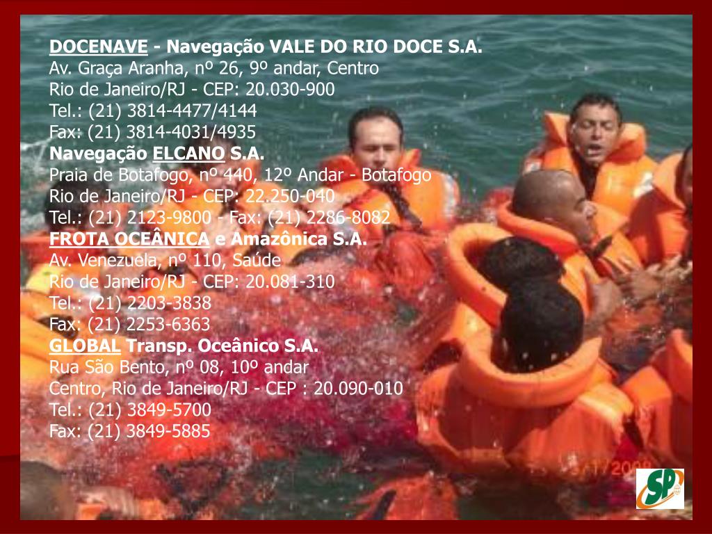 DOCENAVE - Navegação VALE DO RIO DOCE S.A.Av. Graça Aranha, nº 26, 9º andar, Centro Rio de Janeiro/RJ - CEP: 20.030-900 Tel.: (21) 3814-4477/4144 Fax: (21) 3814-4031/4935 Navegação ELCANO S.A.Praia de Botafogo, nº 440, 12º Andar - Botafogo Rio de Janeiro/RJ - CEP: 22.250-040 Tel.: (21) 2123-9800 - Fax: (21) 2286-8082 FROTA OCEÂNICA e Amazônica S.A.Av. Venezuela, nº 110, Saúde Rio de Janeiro/RJ - CEP: 20.081-310 Tel.: (21) 2203-3838 Fax: (21) 2253-6363 GLOBAL Transp. Oceânico S.A.Rua São Bento, nº 08, 10º andar Centro, Rio de Janeiro/RJ - CEP : 20.090-010 Tel.: (21) 3849-5700 Fax: (21) 3849-5885