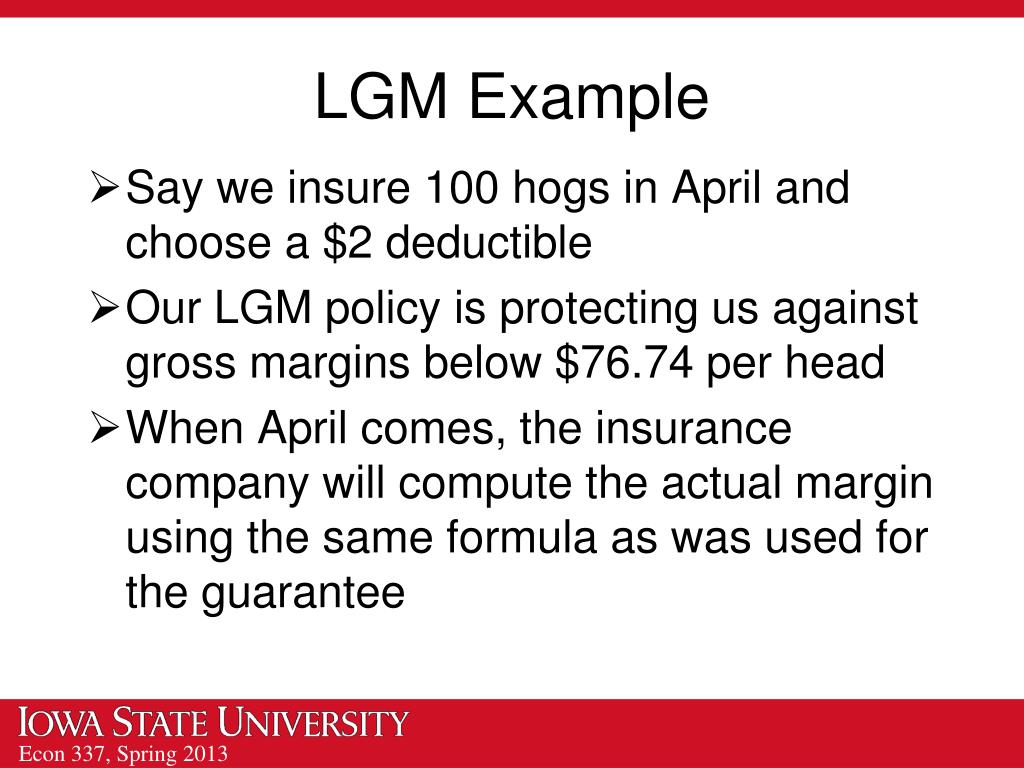 LGM Example Say we insure 100 hogs in April and choose a $2 deductible Our LGM policy is protecting us against gross margins below $76.74 per head When April comes, the insurance company will compute the actual margin using the same formula as was used for the guarantee