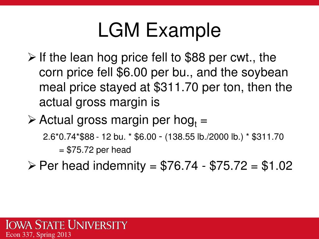 LGM Example If the lean hog price fell to $88 per cwt., the corn price fell $6.00 per bu., and the soybean meal price stayed at $311.70 per ton, then the actual gross margin is Actual gross margin per hogt = 2.6*0.74*$88- 12 bu. * $6.00 - (138.55 lb./2000 lb.) * $311.70 = $75.72 per head Per head indemnity = $76.74 - $75.72 = $1.02