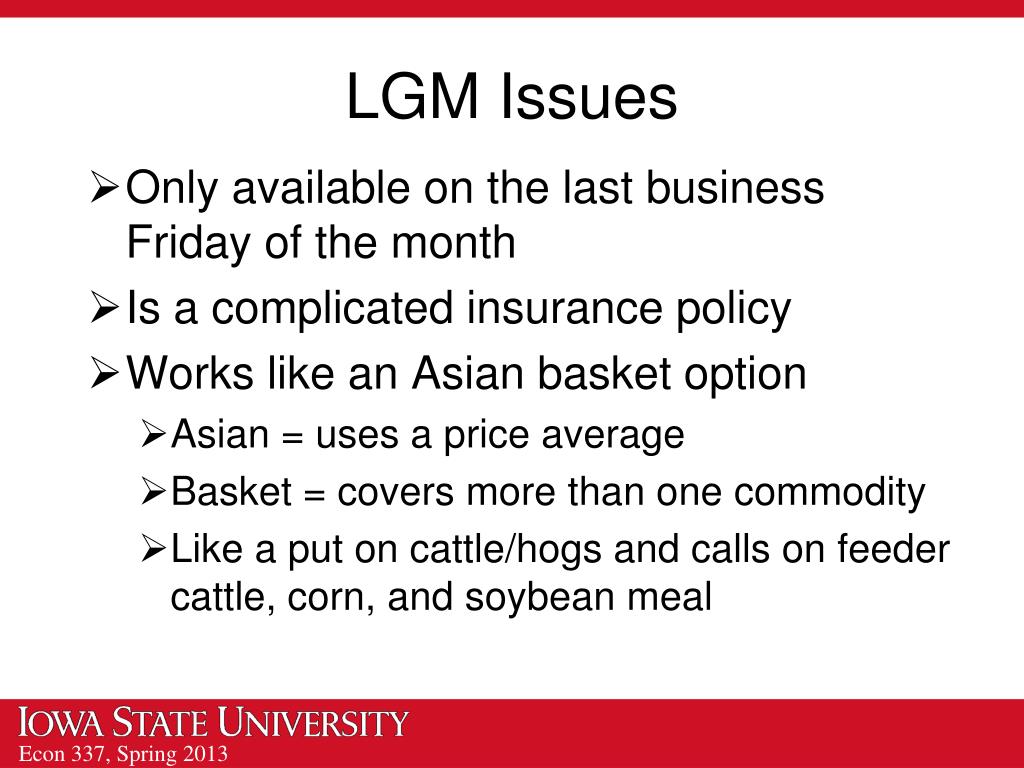 LGM Issues Only available on the last business Friday of the month Is a complicated insurance policy Works like an Asian basket option Asian = uses a price average Basket = covers more than one commodity Like a put on cattle/hogs and calls on feeder cattle, corn, and soybean meal