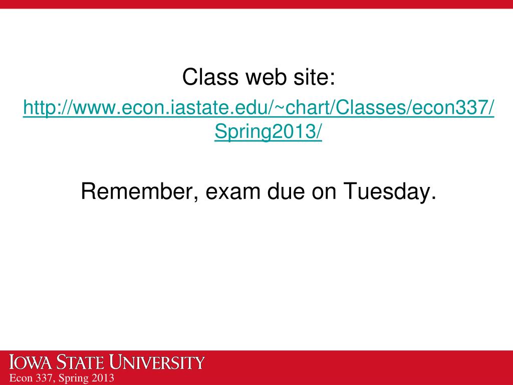 Class web site: http://www.econ.iastate.edu/~chart/Classes/econ337/Spring2013/ Remember, exam due on Tuesday.