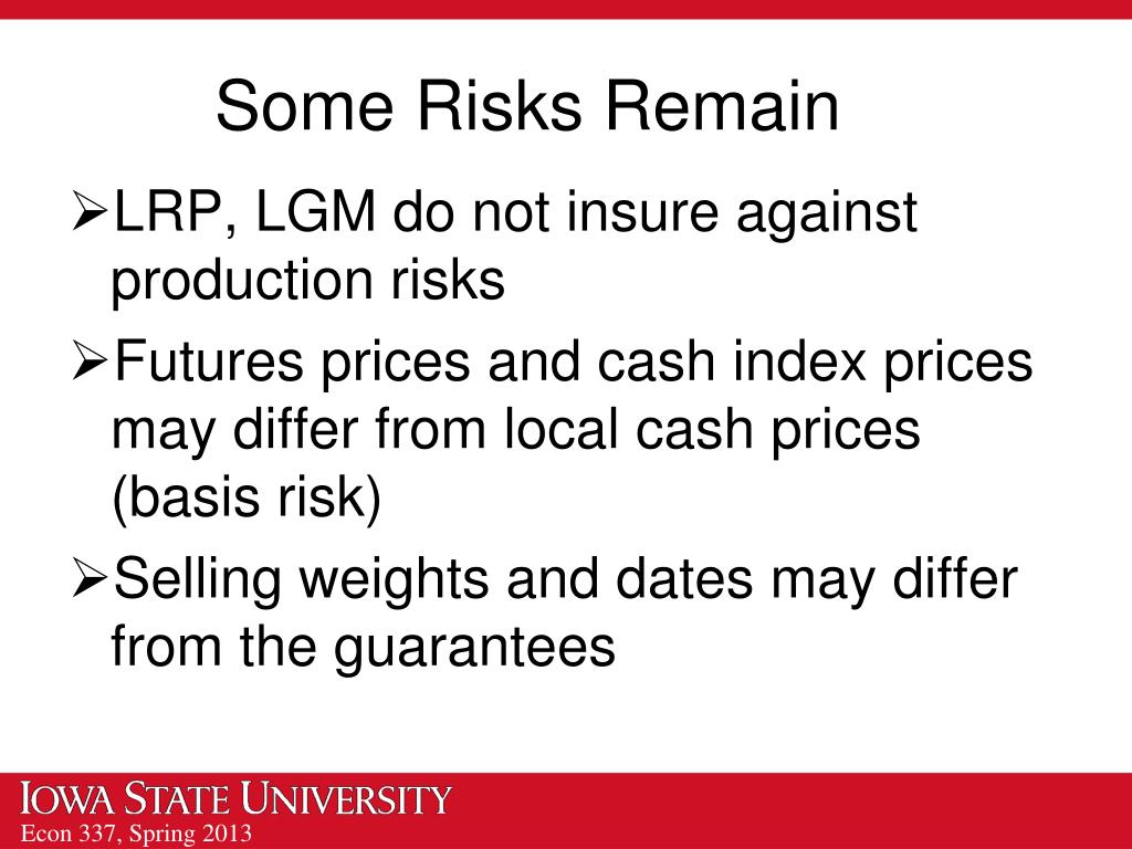 Some Risks Remain LRP, LGM do not insure against production risks Futures prices and cash index prices may differ from local cash prices (basis risk) Selling weights and dates may differ from the guarantees