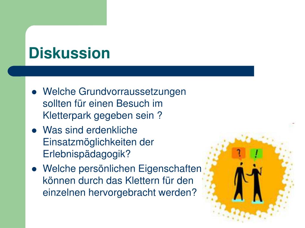 Diskussion • Welche Grundvorraussetzungen sollten für einen Besuch im Kletterpark gegeben sein ? • Was sind erdenkliche Einsatzmöglichkeiten der Erlebnispädagogik? • Welche persönlichen Eigenschaften können durch das Klettern für den einzelnen hervorgebracht werden?