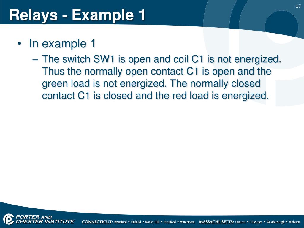 Relays - Example 1 • In example 1 • The switch SW1 is open and coil C1 is not energized. Thus the normally open contact C1 is open and the green load is not energized. The normally closed contact C1 is closed and the red load is energized.