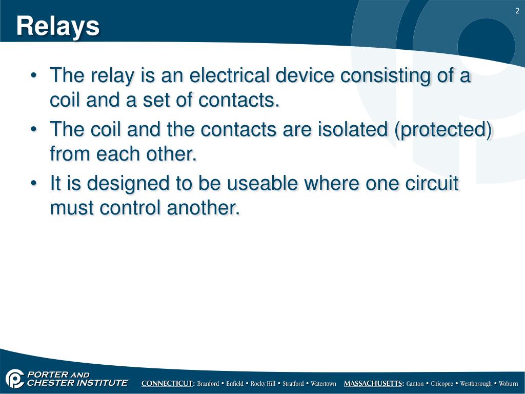 HVACR214 – Oil Electrical. Relays and Contactors. Relays. The relay is an electrical device consisting of a coil and a set of contacts. The coil and the contacts are isolated (protected) from each other. It is designed to be useable where one circuit must control another. The relay coil.