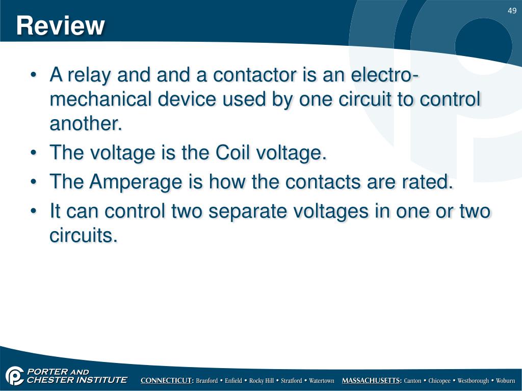 Review • A relay and and a contactor is an electro-mechanical device used by one circuit to control another. • The voltage is the Coil voltage. • The Amperage is how the contacts are rated. • It can control two separate voltages in one or two circuits.