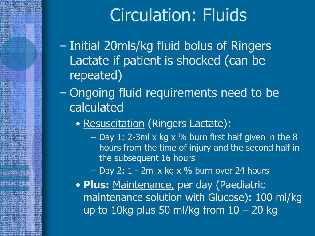 Circulation: Fluids • Initial 20mls/kg fluid bolus of Ringers Lactate if patient is shocked (can be repeated) • Ongoing fluid requirements need to be calculated • Resuscitation (Ringers Lactate): • Day 1: 2-3ml x kg x % burn first half given in the 8 hours from the time of injury and the second half in the subsequent 16 hours • Day 2: 1 - 2ml x kg x % burn over 24 hours • Plus: Maintenance, per day (Paediatric maintenance solution with Glucose): 100 ml/kg up to 10kg plus 50 ml/kg from 10 – 20 kg