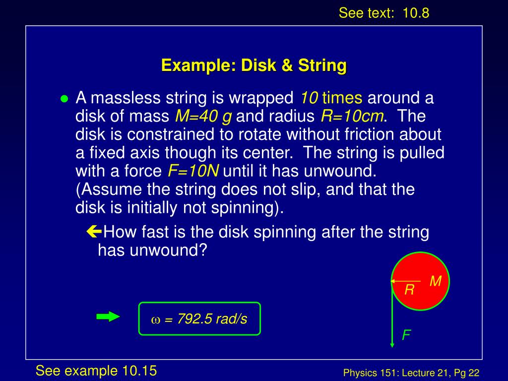 M R = 792.5 rad/s F See text: 10.8 Example: Disk & String • A massless string is wrapped 10 timesaround a disk of mass M=40 g and radius R=10cm. The disk is constrained to rotate without friction about a fixed axis though its center. The string is pulled with a force F=10N until it has unwound. (Assume the string does not slip, and that the disk is initially not spinning). • How fast is the disk spinning after the string has unwound? See example 10.15