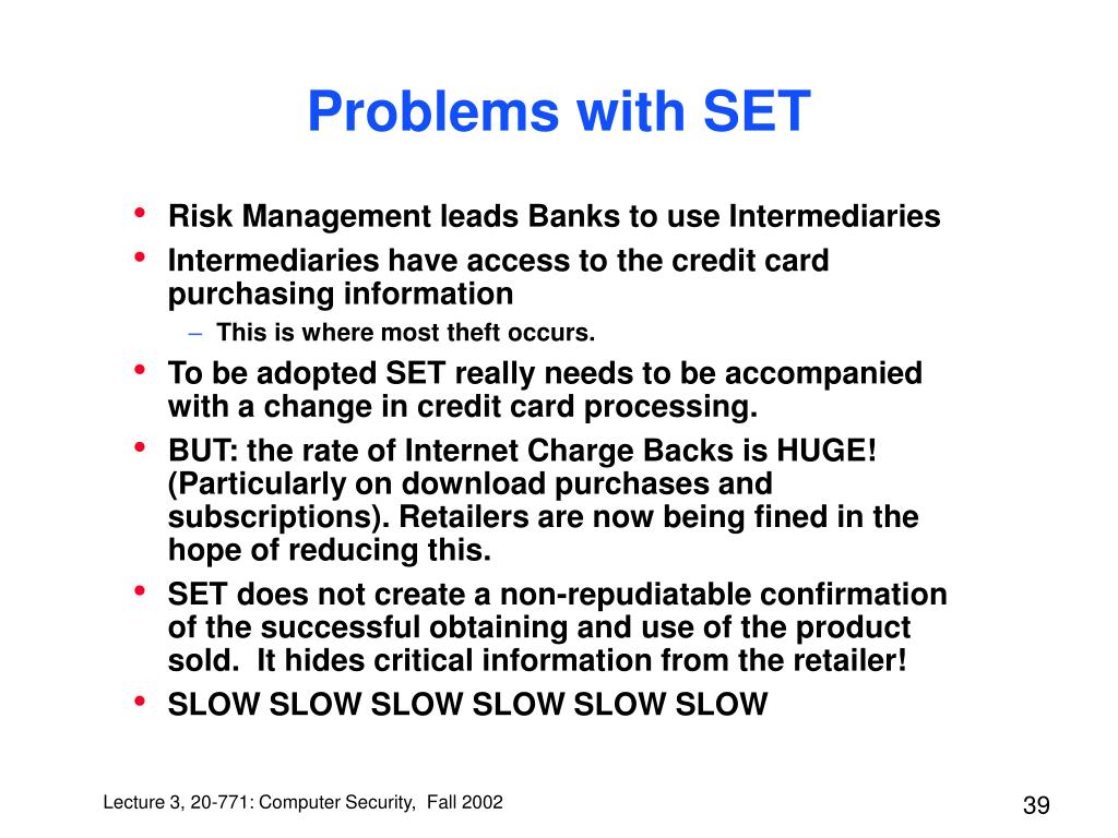 Problems with SET • Risk Management leads Banks to use Intermediaries • Intermediaries have access to the credit card purchasing information • This is where most theft occurs. • To be adopted SET really needs to be accompanied with a change in credit card processing. • BUT: the rate of Internet Charge Backs is HUGE! (Particularly on download purchases and subscriptions). Retailers are now being fined in the hope of reducing this. • SET does not create a non-repudiatable confirmation of the successful obtaining and use of the product sold. It hides critical information from the retailer! • SLOW SLOW SLOW SLOW SLOW SLOW