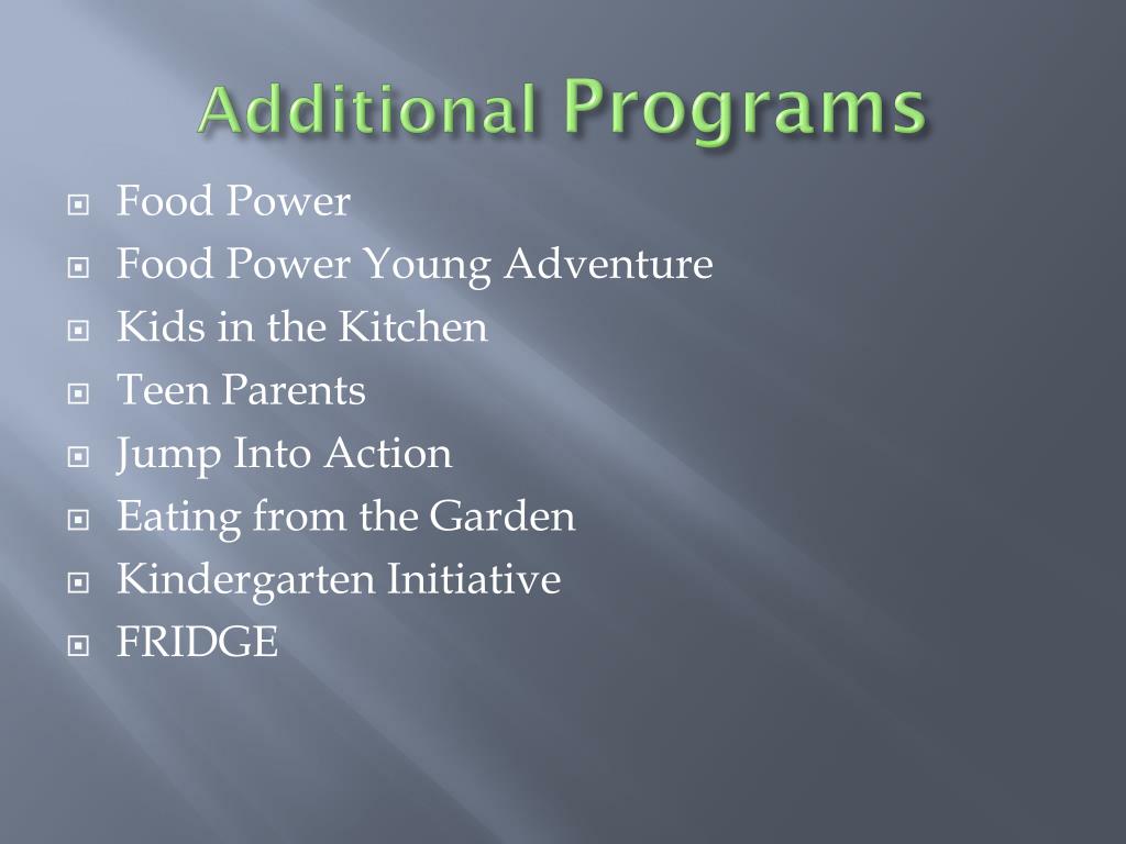 Additional Programs • Food Power • Food Power Young Adventure • Kids in the Kitchen • Teen Parents • Jump Into Action • Eating from the Garden • Kindergarten Initiative • FRIDGE