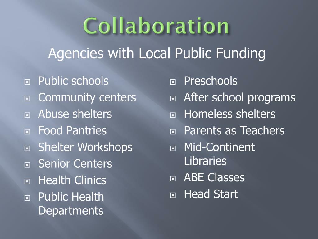 Collaboration Agencies with Local Public Funding • Public schools • Community centers • Abuse shelters • Food Pantries • Shelter Workshops • Senior Centers • Health Clinics • Public Health Departments • Preschools • After school programs • Homeless shelters • Parents as Teachers • Mid-Continent Libraries • ABE Classes • Head Start