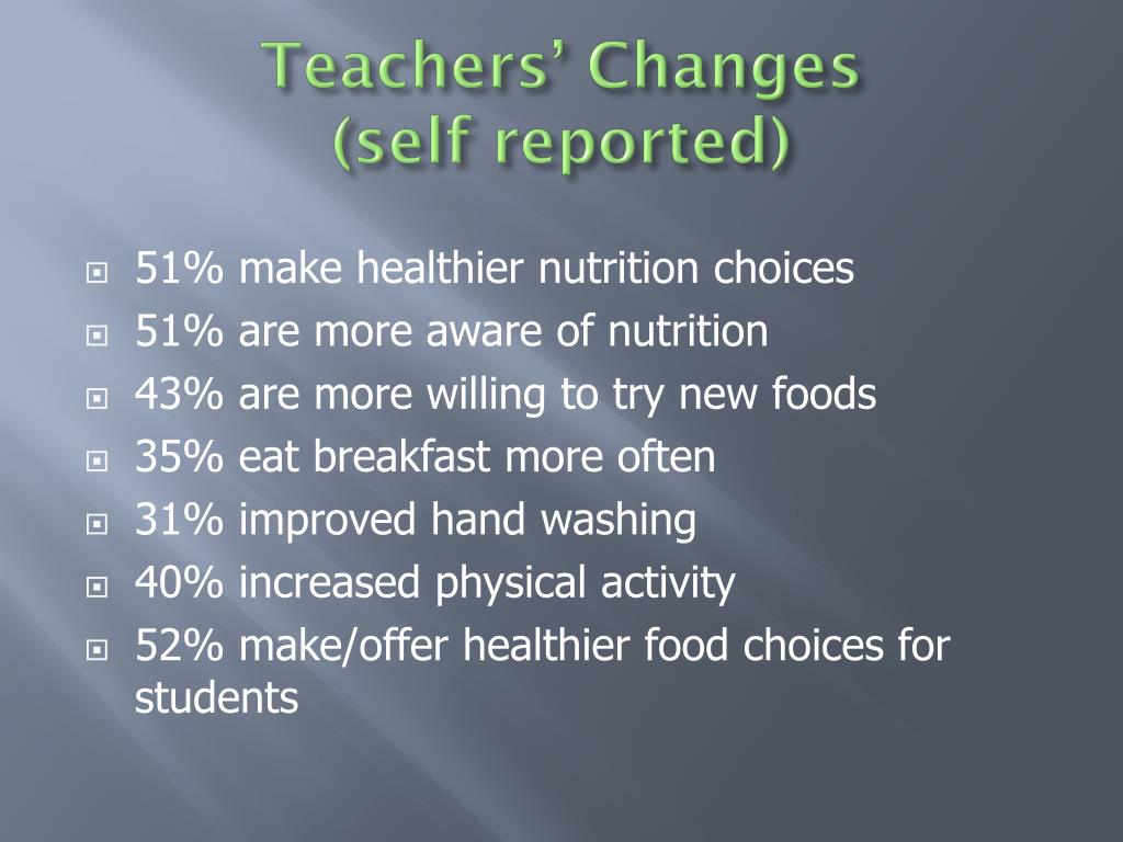 Teachers’ Changes(self reported) • 51% make healthier nutrition choices • 51% are more aware of nutrition • 43% are more willing to try new foods • 35% eat breakfast more often • 31% improved hand washing • 40% increased physical activity • 52% make/offer healthier food choices for students