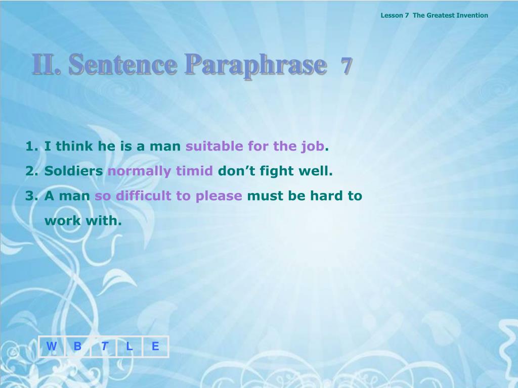 II. Sentence Paraphrase 7 • I think he is a man suitable for the job. • Soldiers normally timid don’t fight well. • A man so difficult to please must be hard to work with.