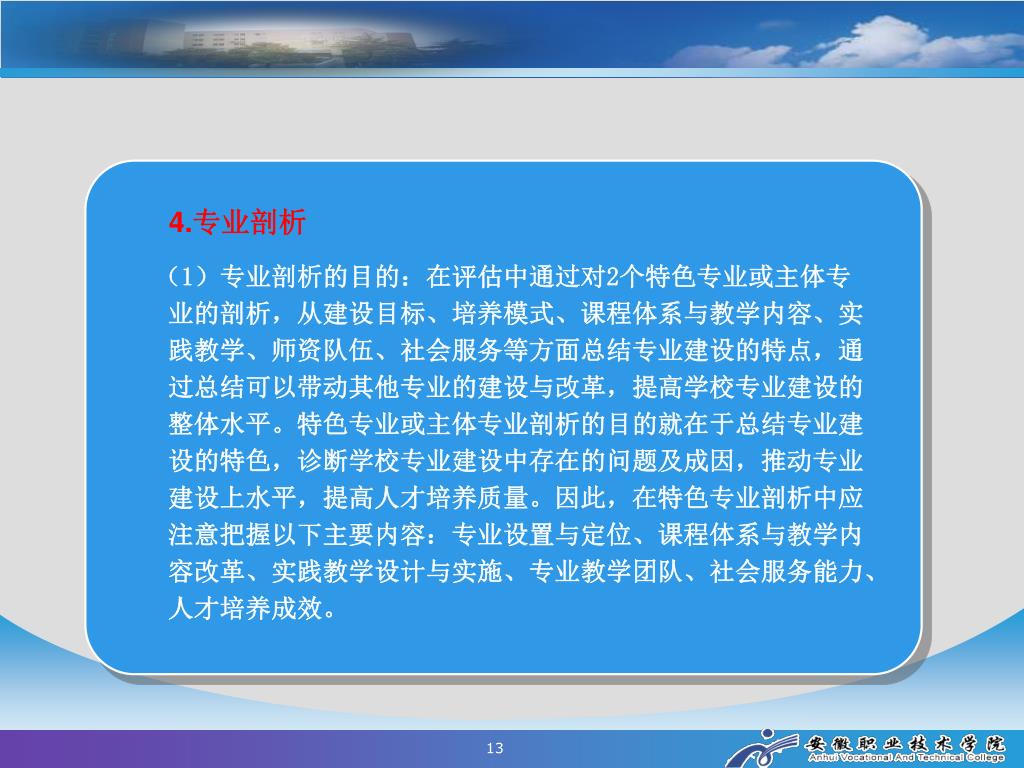 4.专业剖析 (1)专业剖析的目的:在评估中通过对2个特色专业或主体专业的剖析,从建设目标、培养模式、课程体系与教学内容、实践教学、师资队伍、社会服务等方面总结专业建设的特点,通过总结可以带动其他专业的建设与改革,提高学校专业建设的整体水平。特色专业或主体专业剖析的目的就在于总结专业建设的特色,诊断学校专业建设中存在的问题及成因,推动专业建设上水平,提高人才培养质量。因此,在特色专业剖析中应注意把握以下主要内容:专业设置与定位、课程体系与教学内容改革、实践教学设计与实施、专业教学团队、社会服务能力、人才培养成效。