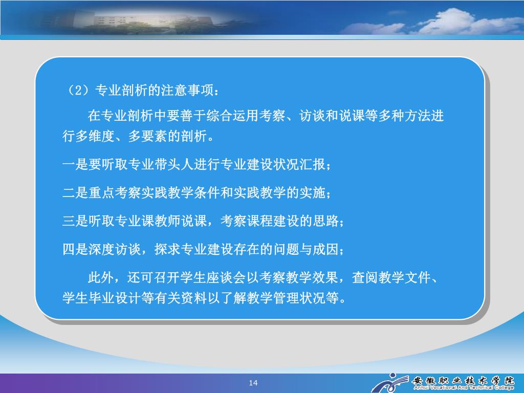 (2)专业剖析的注意事项: 在专业剖析中要善于综合运用考察、访谈和说课等多种方法进行多维度、多要素的剖析。 一是要听取专业带头人进行专业建设状况汇报; 二是重点考察实践教学条件和实践教学的实施; 三是听取专业课教师说课,考察课程建设的思路; 四是深度访谈,探求专业建设存在的问题与成因; 此外,还可召开学生座谈会以考察教学效果,查阅教学文件、学生毕业设计等有关资料以了解教学管理状况等。