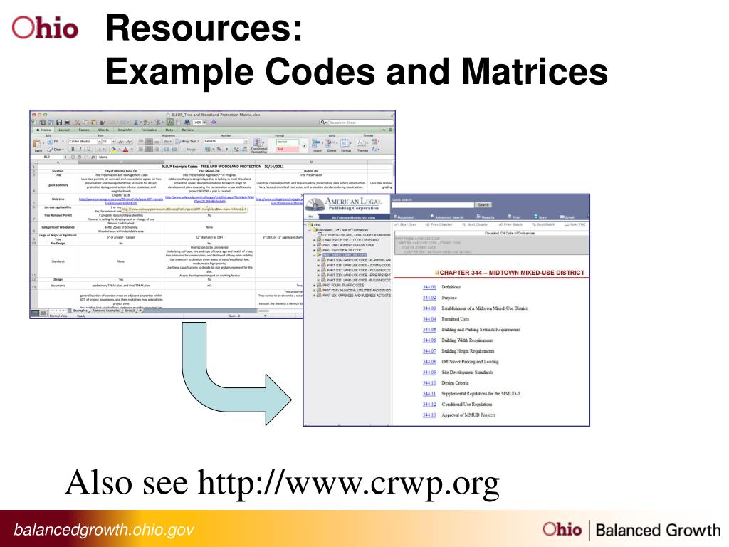 Codes Checklist • Supplement to the Ohio Balanced Growth Program’s Best Local Land Use Practices • Development Regulations • Parking Lot Design • Flood Damage Reduction • Stream and Wetland Setbacks • Flexible Subdivision Design • Compact Development • Tree and Woodland Protection • Natural Areas