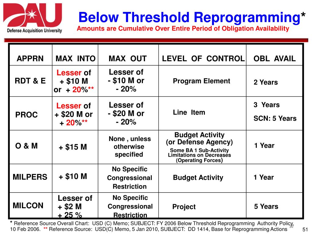 Below Threshold Reprogramming* Amounts are Cumulative Over Entire Period of Obligation Availability APPRN MAX INTO MAX OUT LEVEL OF CONTROL OBL AVAIL Lesser of - $10 M or - 20% Lesser of + $10 M or + 20%** Program Element RDT & E 2 Years Lesser of - $20 M or - 20% 3 Years SCN: 5 Years Lesser of + $20 M or + 20%** Line Item PROC None , unless otherwise specified Budget Activity (or Defense Agency) Some BA 1 Sub-Activity Limitations on Decreases (Operating Forces) 1 Year + $15 M O & M No Specific Congressional Restriction + $10 M 1 Year Budget Activity MILPERS Lesser of + $2 M + 25 % No Specific Congressional Restriction 5 Years Project MILCON *Reference Source Overall Chart: USD (C) Memo; SUBJECT: FY 2006 Below Threshold Reprogramming Authority Policy, 10 Feb 2006. ** Reference Source: USD(C) Memo, 5 Jan 2010, SUBJECT: DD 1414, Base for Reprogramming Actions 51