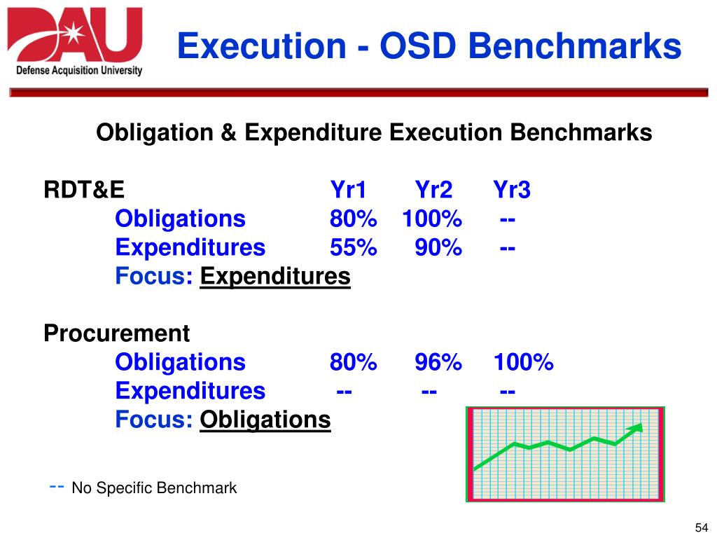 Execution - OSD Benchmarks Obligation & Expenditure Execution Benchmarks RDT&E Yr1 Yr2 Yr3 Obligations 80% 100% -- Expenditures 55% 90% -- Focus: Expenditures Procurement Obligations 80% 96% 100% Expenditures -- -- -- Focus:Obligations --No Specific Benchmark 54