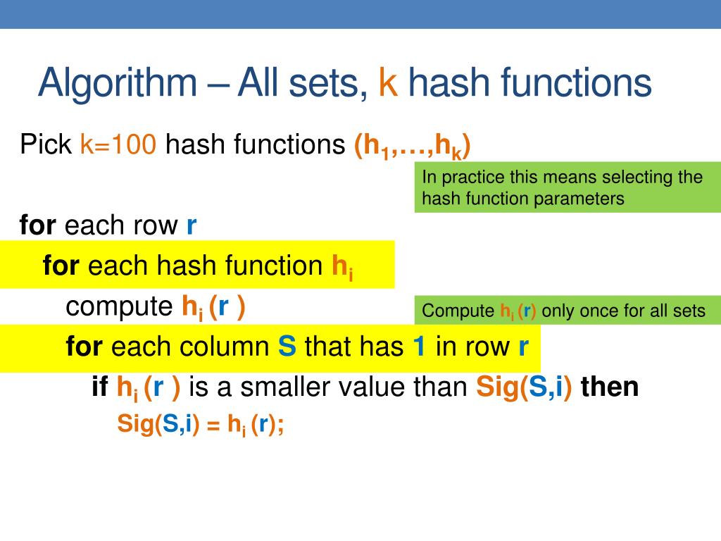 Algorithm – All sets, k hash functions Pick k=100 hash functions (h1,…,hk) for each row r foreach hash function hi compute hi (r ) for each column Sthathas 1 in row r ifhi (r ) is a smaller value than Sig(S,i)then Sig(S,i) = hi (r); In practice this means selecting the hash function parameters Compute hi (r) only once for all sets