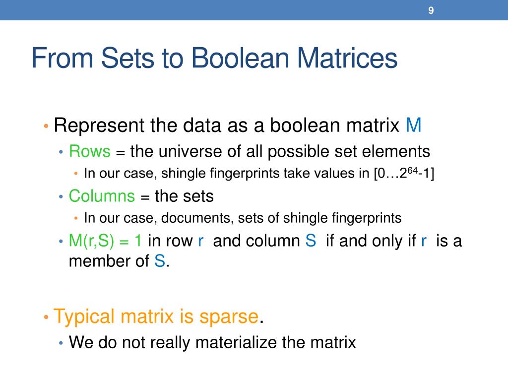From Sets to Boolean Matrices • Represent the data as a booleanmatrix M • Rows= the universe of all possible set elements • In our case, shingle fingerprints take values in [0…264-1] • Columns = the sets • In our case, documents, sets of shingle fingerprints • M(r,S) = 1 in row rand column S if and only if ris a member of S. • Typical matrix is sparse. • We do not really materialize the matrix